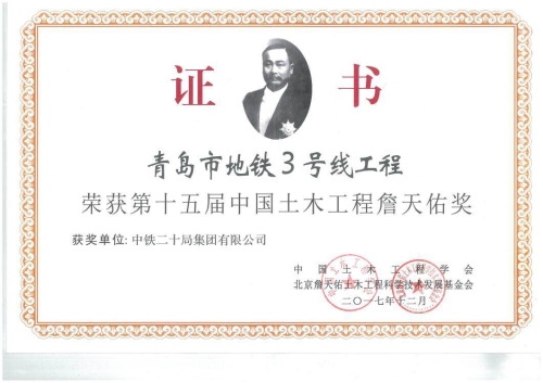 公司參建的青島地鐵3號線獲第十五屆中國土木工程詹天佑獎