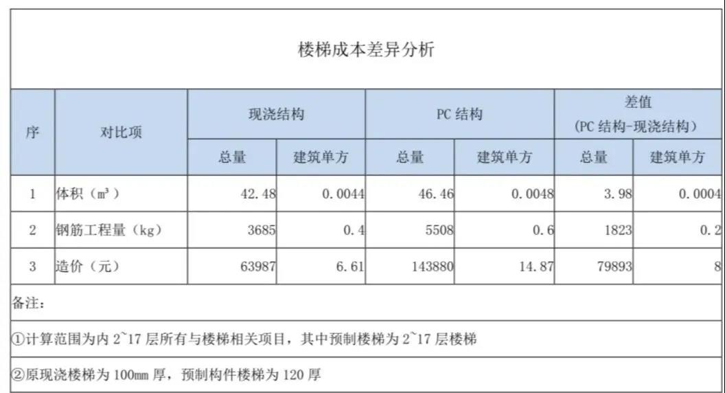 i樓板單價:預(yù)制比現(xiàn)澆樓梯的價格高;ii混凝土含量:預(yù)制構(gòu)件比現(xiàn)澆構(gòu)件高;iii鋼筋含量:預(yù)制構(gòu)件比現(xiàn)澆構(gòu)件高;iv預(yù)制樓板免模板帶來的成本減少不能彌補以上三個因素引起的成本增加。且施工單位因為之前無預(yù)制構(gòu)件施工經(jīng)驗,在施工過程中疊合部處仍鋪設(shè)模板,沒有實現(xiàn)免模板施工,因此模板的費用沒有節(jié)省,因無法實現(xiàn)免模板施工增加費用約計30元/m2。①PC構(gòu)件設(shè)計優(yōu)化:②需要提前策劃,否則會無法實現(xiàn),導(dǎo)致雙倍成本,疊合板處可節(jié)省模板,疊合板處可不使用滿堂腳手架,這兩點必須提前策劃,安排勞務(wù)班組。而現(xiàn)實施工中往往這部分費用無法節(jié)省引起費用增加約30元/平。